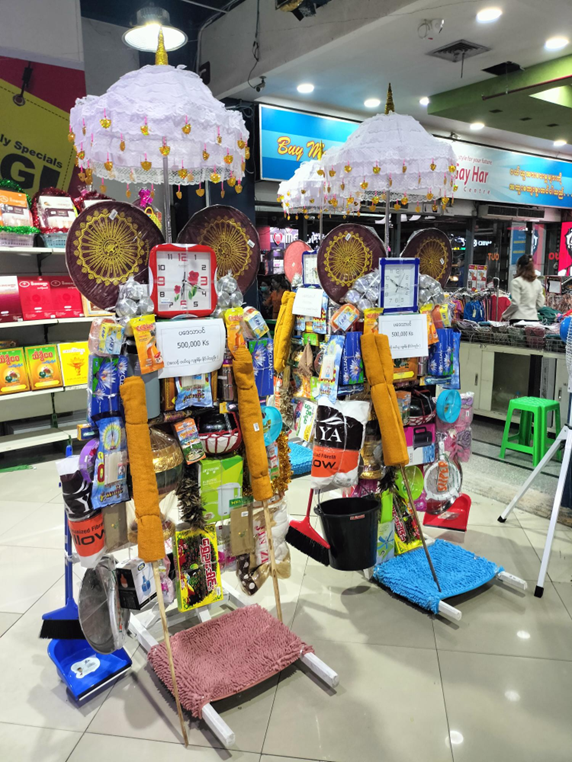 タディンジュの後タザウンダインまでの間、ミャンマー各地で「カティン」と呼ばれる行事が続きます。これは、雨安居(バサ)を終えた僧侶に新しい僧衣や日用品を寄進する伝統で、仏教徒にとって「功徳を積む」大切な行いです。