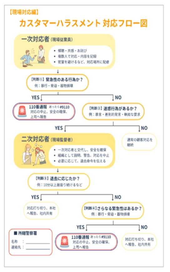 ✓カスタマーハラスメントと判断した場合、「5 カスタマーハラスメントへの対応」に基づき、対応の中止や警察への通報など、適切な対応方法を指示する。