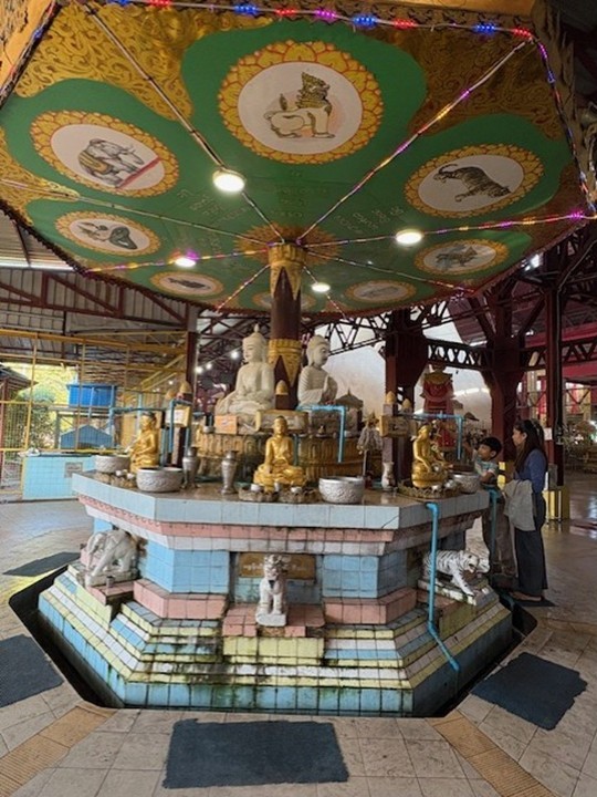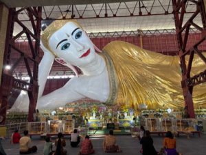 仏教徒が多数のミャンマーでは、普段からお寺詣りをよくするようですが、日本のような初詣の習慣はありません。私はタイに住んでいたころからの長年の習慣で、元旦にお寺詣りに行きました。昨年は、以前のブログ(「ヤンゴン見聞録」 4半世紀にわたり中国、シンガポール、タイなどを渡り歩いてきた筆者の新たな街の体験談_Blog 1 – GIC)掲載のように、世界遺産のシュエダゴォン・パヤーに行きましたが、今年は有名な涅槃仏のあるチャウッターヂー・パヤーヘと足を運びました。全長70m、高さ17mの巨大な涅槃物は圧巻です。顔の表情は、どの角度から見ても優美かつ穏やかな表情で、いつまでも拝んでいたくなります。また、同じ敷地内に誕生日の曜日別の仏像と動物像の拝観所もあり、併せてお詣りしました。私は火曜日生まれなので、動物はライオンです。動物占いによると、私の性格は、正直、情熱的、道徳家なのだそうです。