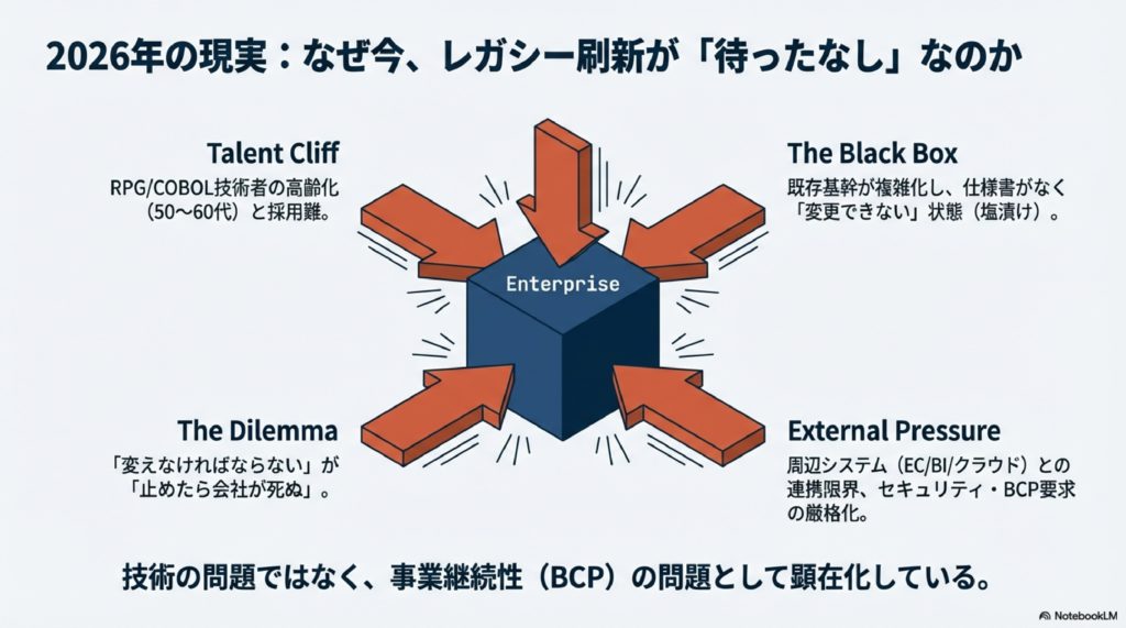 しかし2026年現在、レガシー刷新は「いつかやる」ではなく、待ったなしの経営課題になっています。
