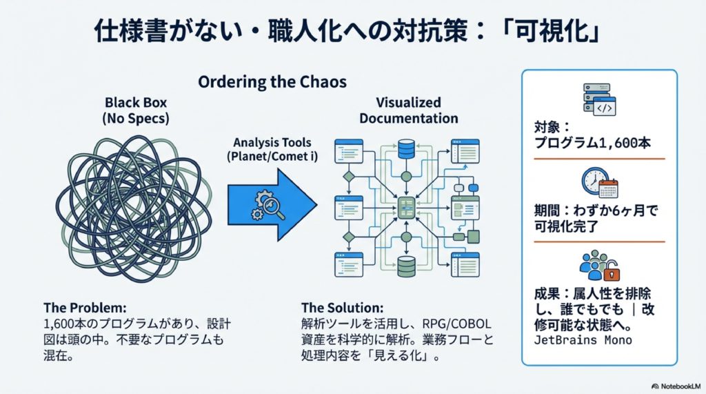 課題は、長年の保守でブラックボックス化し、ベテラン社員への属人化が進んでいたことでした。